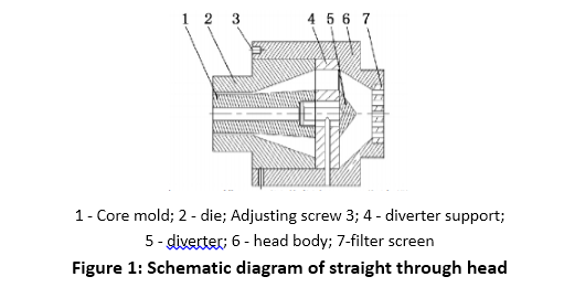 Caput generaliter componitur ex capite corporis, diverticulum, diverticulum, cochleae accommodans, nucleum mori, labium mori, genera etc.pipe extrusionem capitisplerumque in recta per genus, angulum rectum, genus eccentricum, typum spirae et genus calathum tegumentum dividuntur. Recta per caput maxime est usus, cuius structura in figura demonstratur 1. Caput dividi potest in tres partes sequentes: caput corpus et divertor constituunt primam partem capitis, id est sectionem preformem; Compressio sectio diverticuli sup- plicii et nuclei forme secundae partis capitis, id est, compressionis sectionis; Rectae sectiones mori et nuclei faciunt tertiam partem capitis, id est sectionem formatam.